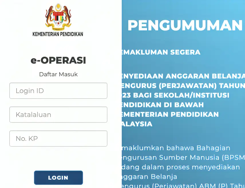 e-Operasi pula adalah sistem yang digunakan untuk pengurusan data guru dan kakitangan sekolah. Melalui e-Operasi, maklumat tentang perkhidmatan, gaji, penempatan, dan pergerakan guru serta kakitangan dapat diurus dengan lebih efisien.